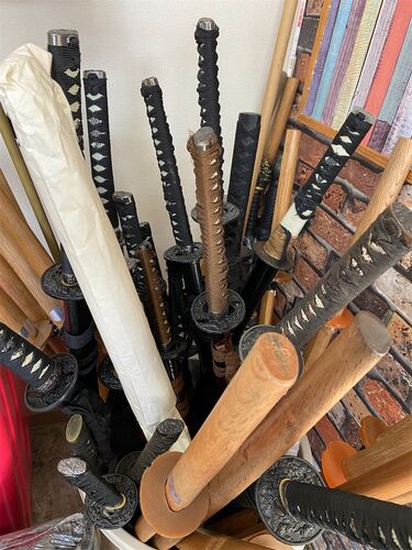明けまして47日目。 今日は朝から倉庫の整理。 長年、太秦の撮影所近くに間借りしている。 刀がたくさん出てきたので、 ホームセンターにデカいバケツを買いに行った。 木刀、竹光、ジュラルミン、舞踊傘などなど。 小道具ってやつですかな。西尾塁